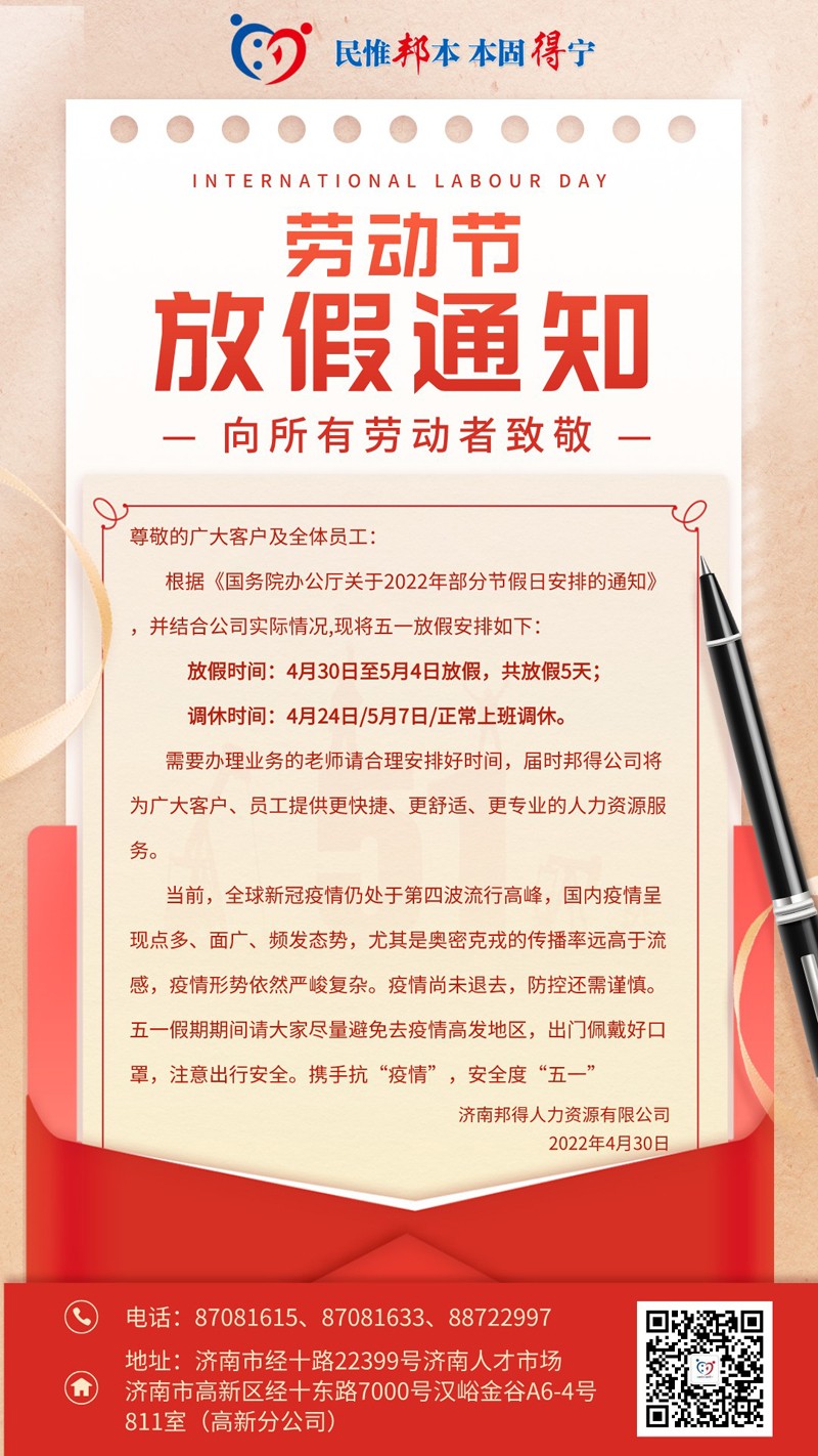 • 2024年5月濟(jì)南邦得人力資源有限公司高新分公司關(guān)于開展...